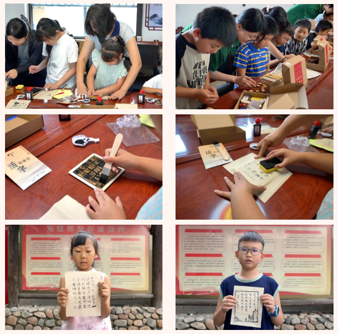 队员们借助活字印刷教具开展沉浸式汉字教学,通过“排版—涂墨—铺纸—压板—揭纸”的完整操作流程,教授孩子们如何进行活字印刷实践。教学过程中,队员们同步讲解汉字的起源、演变以及背后的文化内涵,将汉字文化、普通话教学与古诗词诵读巧妙结合。孩子们在触摸凸版纹路的过程中,亲身感受汉字的温度,感悟语言文字的形态之美、音韵之美与文化之魂。