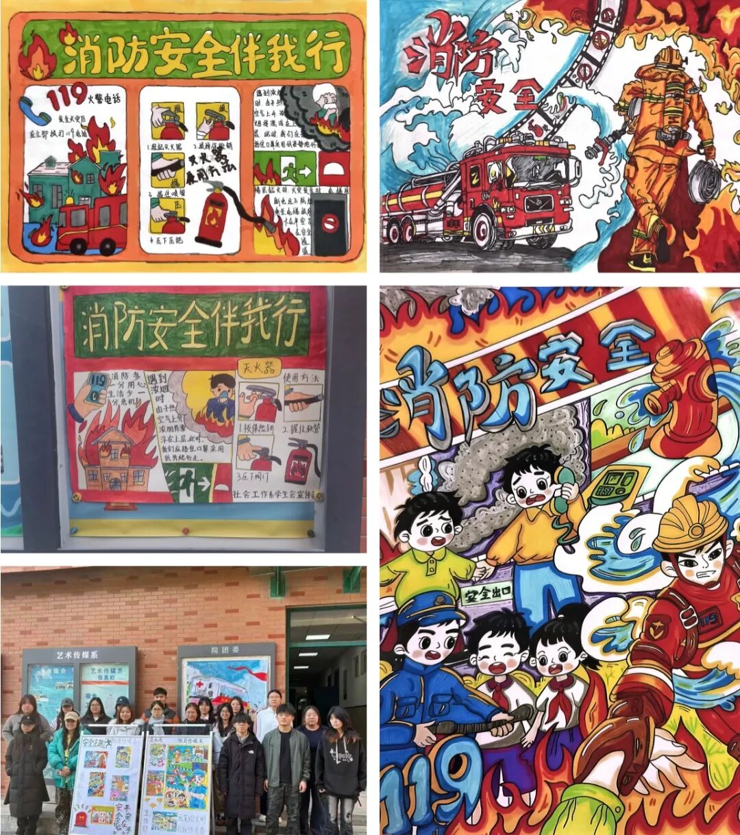 以画笔为媒传安全,以创意为翼筑防线。各系将消防安全知识与艺术创意深度融合,组织学生开展消防主题板报与漫画创作活动。学生作品题材丰富多元,涵盖消防器材认知、火灾逃生技巧、校园防火常识等核心内容,让消防科普在艺术表达中传递“安全至上、责任在肩”的担当精神。