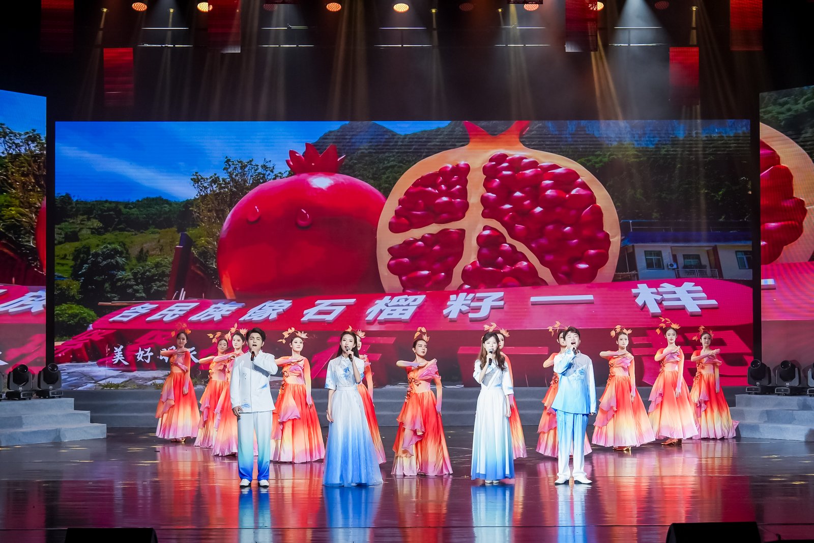 歌舞《石榴颂》各民族歌手同台放歌,舞蹈表演专业以欢快的舞步,展现了各民族兄弟姐妹如石榴籽般紧紧相依的深情厚谊,彰显了民族团结是国家安全最深厚的力量源泉。